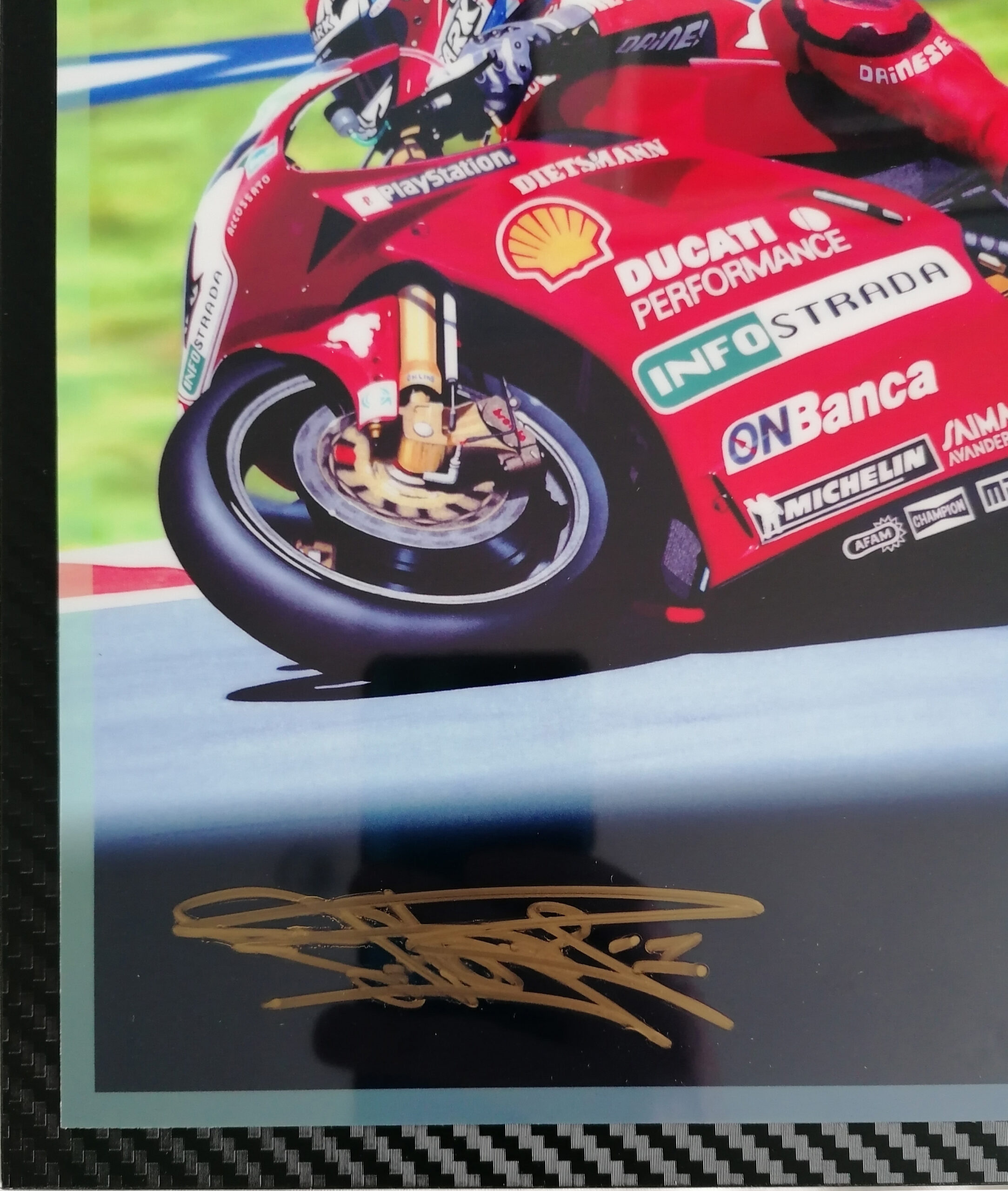 Carl Fogarty is one of the greatest motorbike racers of all time, and the outright greatest World Superbikes rider with 4 World Championships with the iconic Ducati team and an incredible 59 wins from only 220 starts, a win rate of over 25% and podium success of nearly 50%! ‘Foggy’ wasn’t just fast on a race circuit, as he also bagged himself 3 wins at the infamous and highly dangerous Isle Of Man TT and now is your chance to own this beautiful, Carl Fogarty Autographed Limited Edition Plaque made from carbon fibre.