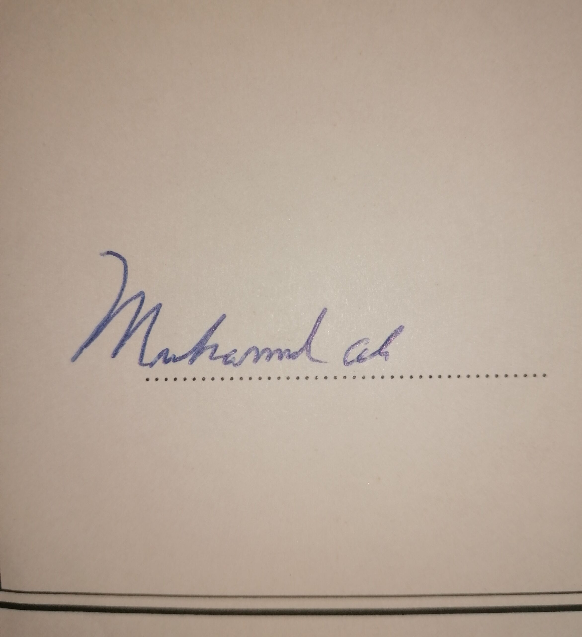 This signed bookplate was produced to mark Ali’s visit, featuring his iconic signature in blue ink on a professionally printed card. The elegant design includes a formal inscription:
