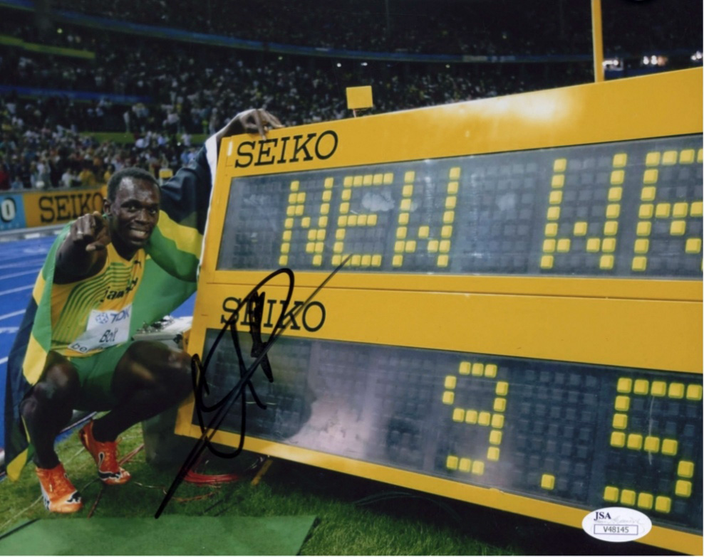This iconic image of him posing next to his 100m World Record time is an image that will go down in history and an image that belongs in any sports or Olympic memorabilia collection.